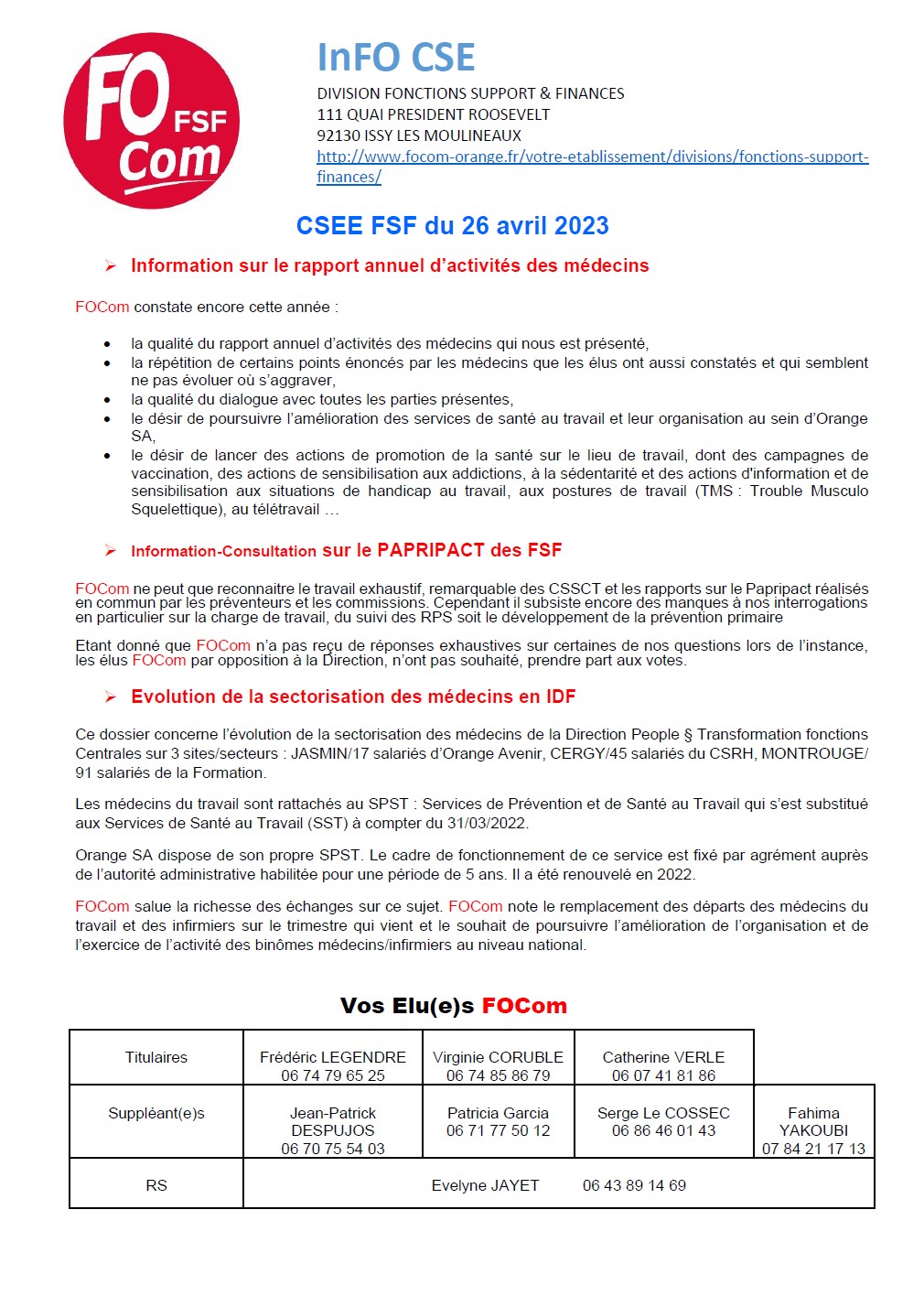 Les élus FOCom et les Organisations Syndicales du Bureau (CFDT, CFTC) du Comité Social et Economique Fonctions Support et Finance, afin de permettre aux salariés de bénéficier au plus tôt des prestations ASC, ont voté le budget prévisionnel 2023 et le programme des prestations ASC 2023 associé…